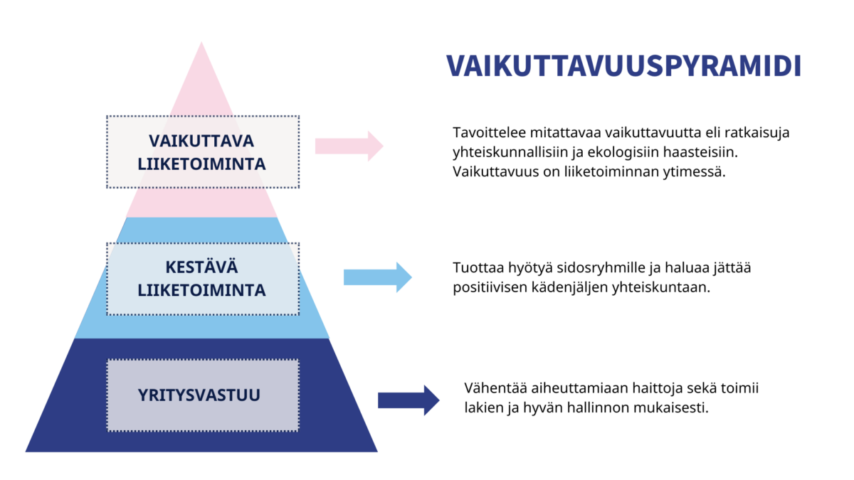 Kaikilla yrityksillä on sekä negatiivisia että positiivisia vaikutuksia ympäristöön ja yhteiskuntaan. Yritysvastuun, kestävän liiketoiminnan ja vaikuttavuuden erot liittyvät siihen, millaisia tavoitteita yrityksellä on näiden vaikutuksien suhteen, ja kuinka keskeisessä roolissa ne ovat liiketoiminnassa. Näiden suhdetta toisiinsa on helppo havainnollistaa vaikuttavuuspyramidin avulla.