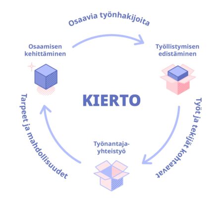 KIERTO-mallissa korostuvat työnhakijoiden ja työnantajien osaamisen kehittäminen sekä työnantajien kanssa tehtävä yhteistyö työllistymisen edistämiseksi. Myös kaupungin työllisyys- ja yrityspalveluiden henkilöstön kiertotalousosaamista parannettiin.