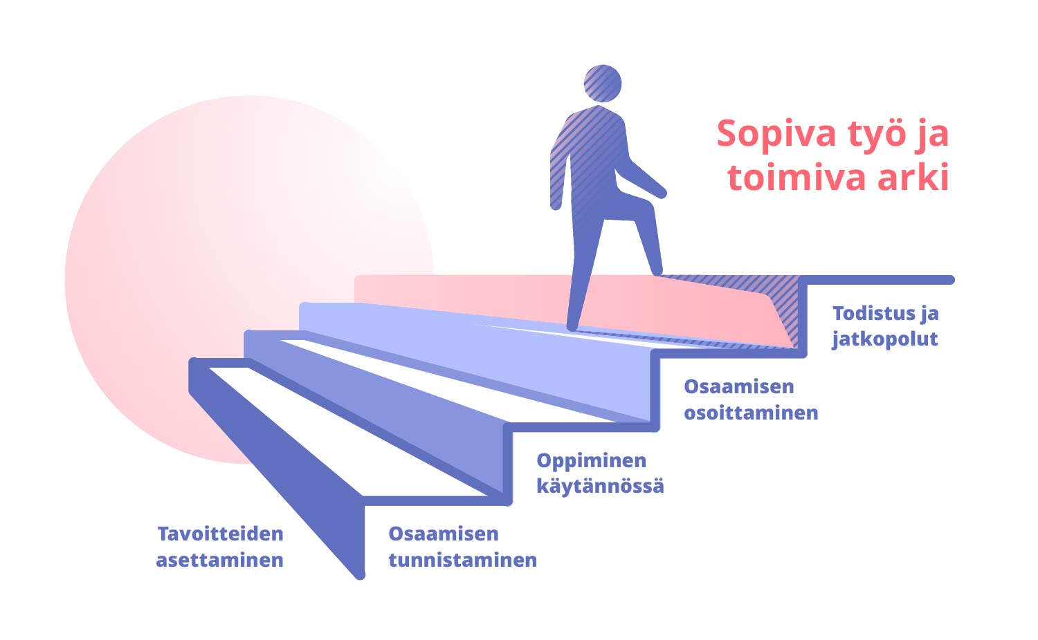 5. Todistus ja jatkopolut: virallinen tutkinnon osatodistus tai Valo-osaamistodistus ja siirtymä kohti koko tutkintoa, palkkatyötä tai jatko-opintoja.