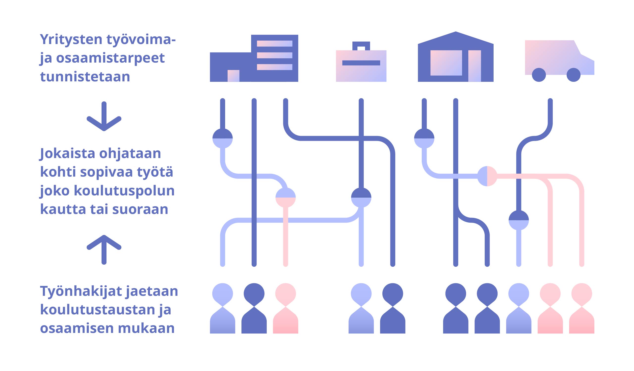 Mallin keskeisinä menetelminä ovat työllistävien yritysten työvoimatarpeiden ja työssä tarvittavan osaamisen tunnistaminen, ja samanaikaisesti työnhakijoiden segmentointi koulutuksen ja työkokemuksen mukaan. Työnantajien tarpeita kartoitetaan jalkautumalla ja soittamalla yrityksiin. Työnhakijoille puolestaan tehdään työhönvalmennuksessa osaamiskartoitus. Näin saadaan selville toimialoittain ne työnhakijat, joilla on riittävä osaaminen alan työtehtäviin ja ne, joiden osaamista tulisi täydentää. Kolmantena vaiheena on työnhakijoiden ja työpaikkojen yhteensovittaminen. Asiakkaita ohjataan työllistäville aloille suoraan tai koulutuksen kautta.